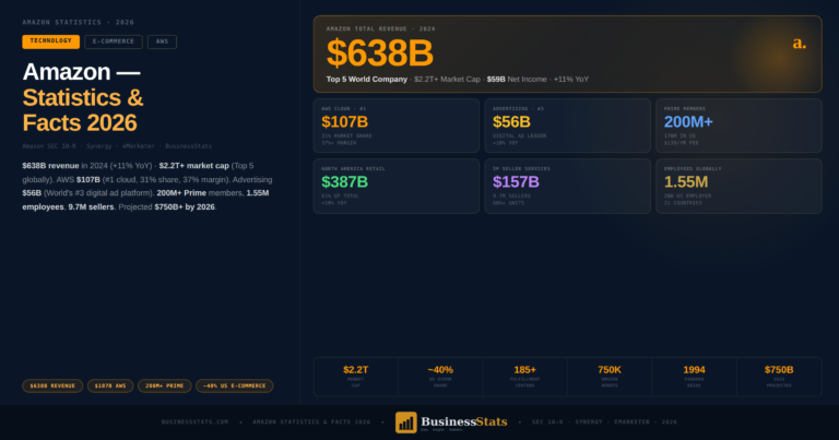 B2C E-CommerceE-CommerceAmazon – statistics & facts 2026 Thomos TMarch 16, 2026April 12, 20260Amazon — Statistics & Facts 2026 Amazon Statistics & Facts Report 2026 Contents In This Report Executive Summary Revenue Chart…
